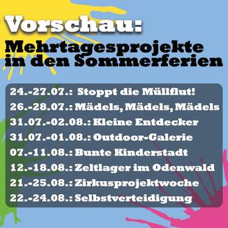 Damit ihr Euch die Termine schon einmal freihalten könnt, hier schon einmal ein Überblick über unsere mehrtägigen Angebote in den Sommerferien.