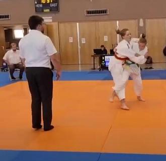 Grace, grüner Gürtel, gewinnt durch Kombination Hüft- und Beinwurf