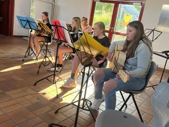 Am Mittwoch, dem 14. Juni 2023, fand im Vorraum der Mensa unserer Schule das jährliche Instrumentalvorspiel statt. Drei Gitarrengruppen und eine Geigengruppe, bestehend aus talentierten Schülerinnen und Schülern der Klassen 5 bis 7, präsentierten vor einem Publikum aus Eltern und Lehrkräften eine beeindruckende Auswahl an kurzen Stücken und ganzen Liedern.