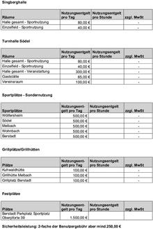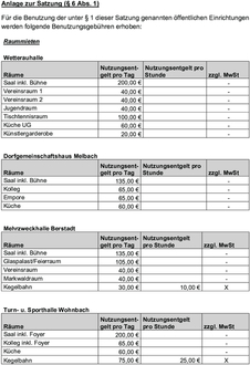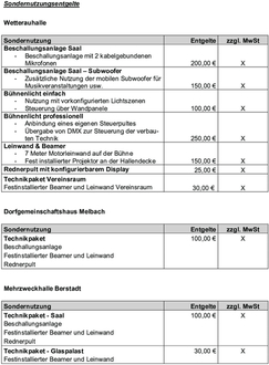 | (2) | Örtlichen Institutionen (Vereine, Kirchen, Schulen und Parteien sowie Wählergemeinschaften) werden die erforderlichen Räumlichkeiten und technischen Einrichtungen bei internen Veranstaltungen ohne Eintrittsgeld (Mitgliederversammlungen, Jahreshauptversammlungen u.ä.) kostenfrei zur Verfügung gestellt. Nicht kostenfrei sind Sonderleistungen wie die Bestuhlung durch die Objektbetreuer. |