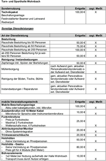 | (3) | Bei Publikumsveranstaltungen mit Eintrittsgeld wird den genannten Organisationen einmal jährlich eine Räumlichkeit mit technischen Einrichtungen kostenfrei zur Verfügung gestellt, danach wird eine Ermäßigung von 50% der Nutzungsentgelte gewährt. Nicht kostenfrei sind die Sonderleistungen wie Bestuhlung durch die Objektbetreuer. |