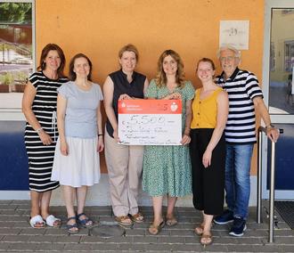 Das Bild zeigt die Übergabe: v.l. A. Hartmann, B. Stöve, V. Ehm, zwei Kolleginnen und Fördervereinsvorsitzender Thomas Gerlach.