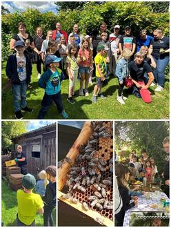 Nachdem wir im Kindergottesdienst das Thema Bienen behandelt hatten, führte unser letzter Kigo Sonntag vor den Sommerferien nun zum Imker. Dort erfuhren wir viel über das Leben der Honig-Bienen, ihre Funktion als Bestäuber von Blüten wie z.B. dem Apfelbaum und Honiglieferant für den Menschen. Auch der „Smoker“ durfte von den Kindern angezündet werden, um die Bienen mit dem Rauch zu beruhigen. An einem Bienenvolk konnten wir Arbeiterinnen, männliche Bienen, die Drohnen, und sogar die auf dem Rücken pink markierte Bienenkönigin sehen, die ihre Eier, aus denen junge Bienen schlüpfen, im unteren Teil des Stockes abgelegt hatte. Die Bienen haben verschiedene Aufgaben im Bienenstock, wie uns der Imker erklärte. Die Arbeiterinnen kümmern sich um die Brut, oder sind als Flugbiene für das Sammeln von Nektar zuständig, der im oberen Teil des Stockes als Honig in die Waben eingelagert wird. Die Wabe wird mit Wachs verschlossen. Die Kinder wussten bereits viel über Bienen, nutzen aber die Gelegenheit viele Fragen an den Imker zu stellen. Nach so viel Informationen konnten wir schließlich den leckeren Honig direkt aus der Wabe probieren und ein kleines Gläschen mit nach Hause nehmen. Herzliches Dankeschön an Imker Peter Leschhorn!