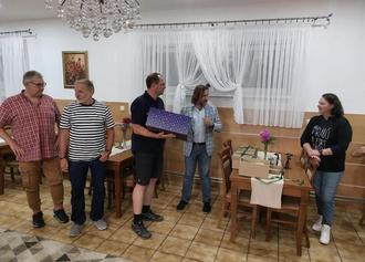 Abends erfolgte dann bei einem gemeinsamen Abendessen mit den Gastgebern und den Feuerwehrleuten aus Rabča die offizielle Übergabe der Gastgeschenke an den Bürgermeister von Rabča, Julius Pitak, und an die örtliche Feuerwehr durch die beiden Wölfersheimer Gemeindevertreter Burkhard Käs, Michael Kräh und der Vorsitzenden des Partnerschaftsvereins Anna Küchenmeister und Wehrführer Thorsten Metz. Im Namen von Bürgermeister Eike See wurde zu einem Besuch in Wölfersheim eingeladen.