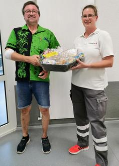 Volker de Vries aus Echzell spendete an diesem Tag zum 125. Mal Blut und wurde von Franziska Hofmann (ehrenamtliche Blutspendebeauftragte des DRK Wölfersheim) mit einem Präsentkorb beschenkt.