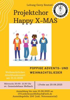 Der Gesangverein Liederkranz Melbach lädt alle Musikbegeisterten herzlich ein, Teil des diesjährigen Projektchors „Happy X-MAS“ zu werden! Unter der Leitung von Gerry Reutzel erwartet euch ein musikalisches Erlebnis voller poppiger Advents- und Weihnachtslieder - modern, schwungvoll und festlich!