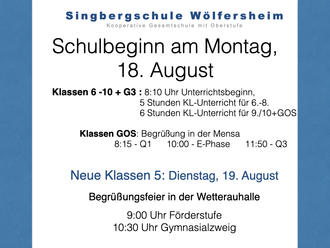 Am kommenden Montag, 18. August, beginnt der Unterricht an der Singbergschule für die Klassen 6-10 sowie der Q3 wie gewohnt um 8:10 Uhr.