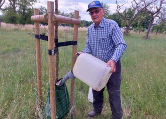 Wie im Artikel schon erwähnt, waren wir in den letzten Wochen hauptsächlich mit dem Gießen der jungen Streuobstbäume beschäftigt. Ca. 80 Bäume haben wir in den letzten Jahren gepflanzt, fast alle befinden sich auf Gemeindegrundstücken und gehören auch der Gemeinde. Wir pflegen sie nur.