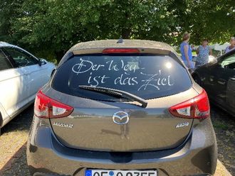 Es entstanden die ersten Schriftbilder. Auch wurde das schöne Wetter dazu genutzt, um auf spielerische Weise einzelne Fahrzeuge der Teilnehmerinnen mit Kreidemarkern zu beschriften.