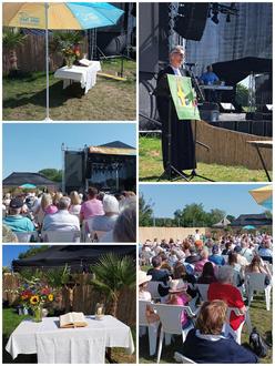 Es regte die Besucherinnen und Besucher an, wie man diese Worte im Alltag integrieren und spüren kann. Organist Christoph Könitzer begleitete den Gottesdienst mit Keyboard und Gesang sowie evangelische Kirchenvorsteherinnen aus dem Nachbarschaftsraum Mittlere Wetterau und katholischen von der kath. Gemeinde in Wölfersheim, die Fürbitten und Gebete lasen. Dank gilt allen, die zum Guten Gelingen des Gottesdienstes beigetragen haben und der Gemeinde Wölfersheim für die erneute Möglichkeit, am See, in toller Kulisse, Gottesdienst feiern zu können.
