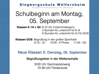 Am kommenden Montag, 05. September, beginnt der Unterricht an der Singbergschule für die Klassen 6-10 sowie der Q3 wie gewohnt um 8:10 Uhr.