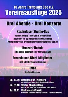 unser Verein wird 10 Jahre alt - und das feiern wir mit einer ganz besonderen Konzertreise: Drei großartige Konzertabende, zu denen wir euch mit unserem kostenlosen Shuttle-Bus bringen!