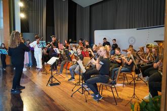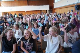 Am zweiten Schultag nach den Sommerferien wurden sieben 5. Klassen an der Singbergschule feierlich aufgenommen. 102 Schülerinnen und Schüler wurden in vier Klassen der Förderstufe aufgenommen und 76 Kinder werden in drei Gymnasialklassen lernen. Die beiden Zweigleitungen Bardo Langsdorf und Tatjana Grohmann begrüßten ihre jüngsten Schülerinnen und Schüler und führten durch das bunte Programm. Als Schule mit den Schwerpunkten Musik und Sport wurden die Kinder und Eltern mit kurzweiligen Beiträgen unterhalten. Das Orchester der Schule, bestehend aus dem Blasorchester und dem Violinensemble, eröffnete die Begrüßungsfeier und lud die Kinder ein, auch ein Instrument in den kommenden zwei Jahren zu lernen. Eine erstaunliche Darbietung im Bodenturnen zeigten die Geschwister Romy und Amelie Stoll, die mit großem Applaus honoriert wurde.