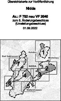 Dieser Änderungsbeschluss, das Flurstücksverzeichnis (Anlage 1) und die Übersichtskarte (Anlage 2) werden in der Flurbereinigungsgemeinde Nidda und in den angrenzenden Städten Hungen, Laubach, Ortenberg, und Schotten sowie in den Gemeinden Echzell, Hirzenhain, Ranstadt und Wölfersheim öffentlich bekannt gemacht und im Staatsanzeiger nachrichtlich veröffentlicht.