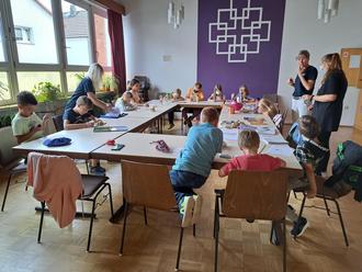 Beim letzten Kigo beschäftigten sich die Kinder des Kindergottesdienstes mit der Geschichte, in der Jesus die Kinder zu sich rief. Veranschaulicht wurde die Erzählung diesmal mit Kerzen. Eine große weiße Kerze stellte Jesus dar, während viele kleine Teelichter die Kinder symbolisierten. Passend dazu gab es ein Ausmalbild mit persönlichem Segensspruch. Jedes Kind malte sich selbst unter die segnende Hand von Jesus. Zum Abschluss nach dem Vater Unser gaben sich die Kinder noch gegenseitig einen Segen für die kommende Woche.