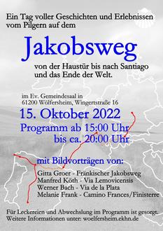 Am Samstag 15. Oktober von 15:00 bis 20:00 Uhr lädt die Ev.-ref Kirchengemeinde Wölfersheim zum Pilgertag ins Gemeindehaus ein. Es wird vier Erfahrungsberichte über das Pilgern auf unterschiedlichen Jakobswegen und reichlich Gelegenheit zum Austausch zum Thema Pilgern geben. Parallel ist ein kleiner Flomarkt für Wander- und Outdoorbekleidung geplant. Dabei können Kleidung, Ausrüstung, Pilger- u. Wanderbücher, alles, was eine zweite Chance verdient hat, angeboten werden.
