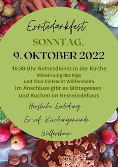 | 10:30 Uhr | Wölfersheim, Erntedankgottesdienst mit Kigo, Kirche, anschl. Mittagessen |