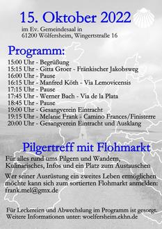 Am Samstag 15. Oktober von 15:00 bis 20:00 Uhr lädt die Ev.-ref Kirchengemeinde Wölfersheim zum Pilgertag ins Gemeindehaus ein. Es wird vier Erfahrungsberichte über das Pilgern auf unterschiedlichen Jakobswegen und reichlich Gelegenheit zum Austausch zum Thema Pilgern geben. Parallel ist ein kleiner Flomarkt für Wanderzubehör geplant. Dabei können Kleidung, Ausrüstung, Pilger- u. Wanderbücher, alles, was eine zweite Chance verdient hat, angeboten werden.