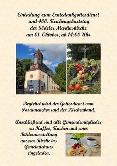 Anlässlich des 400. Geburtstages der Evangelischen Martinskirche Södel, welche um 1623 ihre endgültige Gestalt durch den Baumeister Johann Reuß aus Södel erhielt, finden am 01.10.2023 zusammen mit dem Erntedankgottesdienst die Geburtstagsfeierlichkeiten dazu statt!
