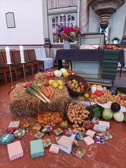 Am vergangenen Sonntag wurde Erntdankfest in unserer Kirche gefeiert. Prädikant Arndt Faludi stellte das Thema Dankbarkeit in seiner lebendigen Predigt in den Mittelpunkt. In kleinen Geschenkboxen konnte jeder festhalten, wofür er dankbar ist, und bei den Erntegaben vor dem Altar stapeln. Im Anschluss durfte frisch gepresster Apfelsaft gekostet werden. Die gespendeten Lebensmittel kommen dem Karl- Wagner-Haus in Friedberg zugute - herzlichen DANK für Ihre Spenden aus Garten und Feld oder dem Supermarkt.