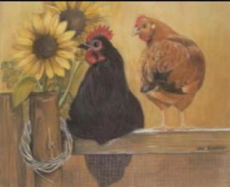 Ein heimeliges Motiv von Hahn und Henne im Hühnerstall hat Ute Biecker zu Papier gebracht.