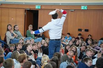 Tino Leo gelang es dabei virtuos, die Kinder mithilfe weniger Requisiten immer wieder in seinen Bann zu ziehen. Im Anschluss hatten die Schülerinnen und Schüler jede Menge Fragen rund um die Themen Schauspiel und Künstlerleben an den „Histotainer“, der diese gerne beantwortete.