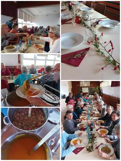 Am 18. Oktober konnten um die Mittagszeit wieder rund 25 Gäste von den fünf Kochenden bewirtet werden. An der liebevoll dekorierten und eingedeckten Tafel ließ man sich Kürbis- und Erbsensuppe schmecken. Auch freute man sich, das ein oder andere Gesicht mal wieder zu sehen und ein „Schwätzchen“ zu halten. Die Teilnahme einmal monatlich ist ohne vorherige Anmeldung möglich. Wer Freude am Kochen hat und bei den Vorbereitungen mitwirken möchte, darf sich im Gemeindebüro melden. Der nächste Termin ist am Freitag, 22. November 2024, dann wird allerdings für 17 Uhr eingeladen. Falls ein Fahrdienst benötigt wird, bitten wir um Anmeldung unter Tel.: 5034 im Gemeindebüro.