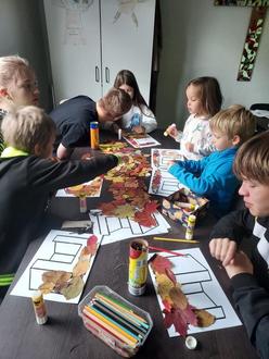 Im vergangenen KiGo lernten die Kinder das jüdische Laubhüttenfest (Sukkot) kennen, welches auch als (Ernte)-Dankfest gefeiert wird und daher gut zur Jahreszeit passt. Wir schauten einen Film über die sogenannte Sukka, die Laubhütte, die die Jüdinnen und Juden während des siebentägigen Festes bauen und darin wohnen und feiern. Danach konnten die Kinder ihre eigene Laubhütte mit gesammelten, bunten Blättern selbst gestalten und es entstanden tolle, bunte Kunstwerke.