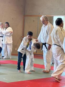 Trainer Albrecht gibt Hilfestellung beim Ippon-seoi-nage (Schulterwurf)