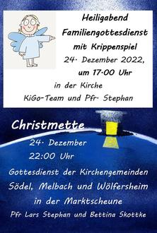 | 22:00 Uhr | Melbach/Södel/Wölfersheim, Christmette, Marktscheune, Pfr. Stephan u. Bettina Skottke |