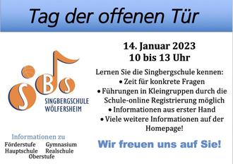 endlich können wir interessierten Eltern für die anstehende Wahl der weiterführenden Schule nach der 4. Klasse die Singbergschule am Tag der offenen Tür wieder in ihrer Vielfältigkeit vor Ort präsentieren. Die Singbergschule öffnet am 14. Januar 2023 ihre Unterrichtsräume und begrüßt Sie und Ihr Kind in der Zeit von 10 bis 13 Uhr.