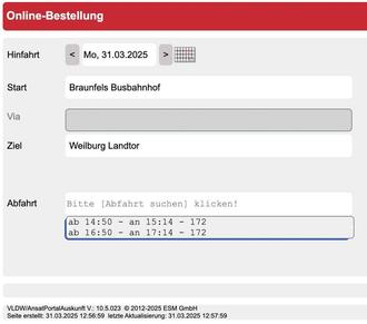 Die Anmeldung erfolgt Montag bis Samstag bis 60 Minuten vor Abfahrt und an Sonn- und Feiertagen einen Werktag vorher bis 18 Uhr unter der Telefonnummer: 06441-20 313 20.