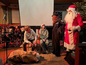 Eindrucksvoll das Anspiel durch vier Konfis aus den Gemeinden Brandoberndorf-Weiperfelden und Altenkirchen-Philippstein, die am Heiligen Abend aus Langeweile und Frust den Weihnachtsmann ausrauben auf seinem Weg in ein Kinderheim. Wenig später werden sie beim Aufteilen der Beute gefasst und müssen den Weihnachtsmann ins Kinderheim begleiten, was ihrem Leben eine ganz neue, positive Wendung gibt.