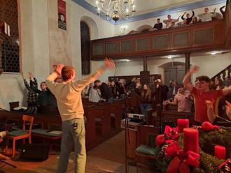 Beim „Warm up“ vor Beginn des Gottesdienstes kamen die zumeist jugendlichen Besucherinnen und Besucher ganz schön in Schwung.