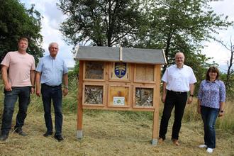 Der Leiter der EAM-Netzwerkregion Wetzlar, Burkhard Meth (2.v.re) übergibt Bürgermeister Bernd Heine (2.v.li) das gestiftete XXL-Insektenhotel - umrahmt von den Gemeindemitarbeitern Lars Werner und Pia Werling