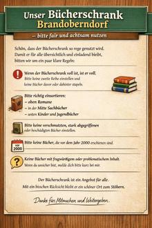 Der Bücherschrank wird sehr rege genutzt. Damit er für alle übersichtlich und einladend bleibt, bitten wir darum, die ausgehängten Regeln zu beachten - insbesondere, wenn der Schrank voll ist oder Bücher eingestellt werden.