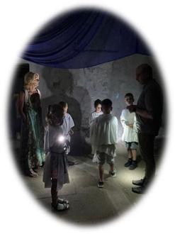 Im Kellergewölbe begann die Suche der Kinder mit Taschenlampen (Geschenk der Kita) nach dem Gespenst. Hat es sich hinter der Tür versteckt? Nach und nach fanden die Kinder Spielzeug von Härmel und spielten selbst damit. Da das Gespenst Süßigkeiten liebt, legten die Kinder eine Fährte mit Bonbons um es aus seinem Versteck zu locken. Nun hieß es abwarten!