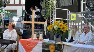 Im Rahmen des „2. Apfelweinfestchens“ auf dem Lindenplatz in Waldsolms-Brandoberndorf feierte die Gemeinde Waldsolms letztes Wochenende das 200-jährige Bestehen des historischen Rathauses und die ausrichtende Gruppe des Festes, die „Presskopp-Singers“ ihr 50-jähriges Bestehen.Die Feierlichkeiten waren zugleich ein wunderbarer Anlass, um einen ökumenischen Gottesdienst auf dem Lindenplatz zu feiern. Draga Balena, Katharina Groß und Siggi Veit von der Gruppe Friends aus Weiperfelden umrahmten mit vier mitreißenden Liedbeiträgen, unter anderem auch einem Gospelmedley, diesen musikalischen Gottesdienst, der von Gemeindereferentin Ruth Reusch und Prädikantin Doris Frenes geleitet wurde. Zwei kleine Apfelbäumchen, ein James Grieve und ein Galina, haben dabei auch eine Rolle gespielt. Im Gottesdienst wurde der große Dank dafür zum Ausdruck gebracht, was Menschen gemeinsam bewirken und gestalten können, wenn sie die ihnen anvertrauten einzigartigen Fähigkeiten und Talente einsetzen, und wie segensreich sich dies in einer Gemeinschaft auswirkt.