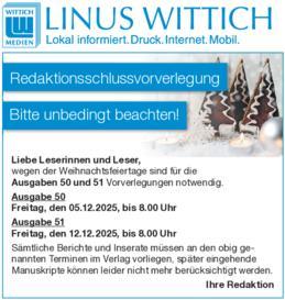 Redaktionsschlussvorverlegung Weihnachten 2025