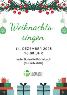 Wir laden auch in diesem Jahr wieder zu einem offenen Weihnachtssingen am Sonntag, den 14.12.2025 um 16.00 Uhr in der Ortsmitte in Kröffelbach (Bushaltestelle) ein.