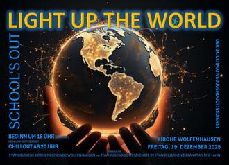 in der Kirche zu Wolfenhausen. Das SCHOOL’S OUT Jugendgottesdienstteam des evangelischen Dekanats an der Lahn und die Kirchengemeinde Wolfenhausen laden zu SCHOOL’S OUT 24 ein. „SCHOOL’S OUT“ heißen die ultimativen Jugendgottesdienste des Dekanats an der Lahn. Jugendliche und junge Erwachsene aus verschiedenen Gemeinden gestalten diesmal zusammen mit Konfirmandinnen und Konfirmanden und gemeinsam mit Pfarrerin Konstanze Buddruss und Pfarrer Jörg Lange diesen 24. Event des Dekanats für Jugendliche zwischen 13 und 20 Jahren. Am 21. Dezember 2018 fand der erste Dekanatsjugendgottesdienst „SCHOOL’S OUT“ in der Kirche zu Brandoberndorf statt und an diesem Freitag werden Konfirmanden- und Jugendgruppen aus dem ganzen Dekanat in Wolfenhausen zu Gast sein, um gemeinsam mit der Band „School of Rock“ und dem Jugendgottesdienstteam und unserem Konfi-Team den nächsten ultimativen SCHOOL’S OUT Jugendgottesdienst zu feiern. Das Thema lautet diesmal: „LIGHT UP THE WORLD“ Nach einer Warm-Up-Phase beginnt der Jugendgottesdienst gegen 19 Uhr. Nach Ende des Gottesdienstes gegen 20.30 Uhr ist dann noch ausreichend Zeit zum Chillen, Essen und Trinken.