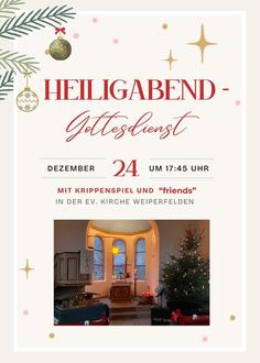 | Mi., 24.12. | Christvesper: Familien-Gottesdienst — 17.45 Uhr |
