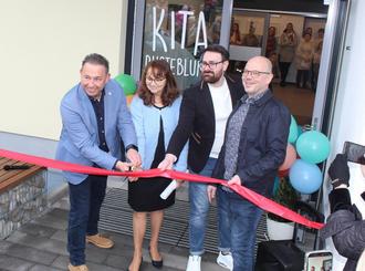 Bürgermeister Roland Hörster (li) und Kita-Leiterin Petra Wißemborski durchschneiden - unterstützt von den Architekten - das Band zur Eröffnung der Kita "Pusteblume"