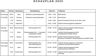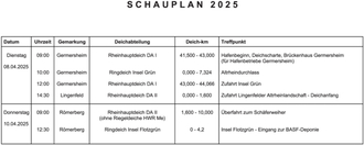 Die Struktur- und Genehmigungsdirektion Süd, Deichmeisterei/Neubaugruppe Hochwasserschutz Speyer führt vom 27.03.2025 bis 10.04.2025 die Schau des Rheinhauptdeiches zwischen Berg/Pfalz und Römerberg durch.