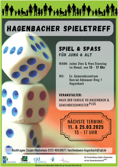 Wir spielen verschiedene Spiele, gerne auch Klassiker, in gemütlicher Runde bei Kaffee und Keksen. Jeden zweiten und vierten Dienstag im Monat, 15:00 Uhr – 17:00 Uhr im ev. Gemeindezentrum, Konrad-Adenauer-Ring 45, Hagenbach.