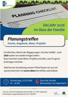 Am Donnerstag, dem 12. März 2026 um 16:00 Uhr treffen wir uns mit allen Interessierten im Haus der Familie, um die Events im Jahr 2026 zu besprechen. Wir freuen uns über bekannte und neue Gesichter und viele neue Ideen. Einfach vorbeikommen, es gibt auch Kaffee und Kuchen.