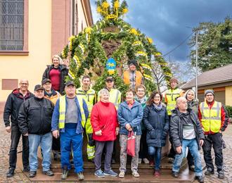Ideenreich und engagiert. Christian Hutter bedankt sich beim Kreativteam des Bauhofs und den ehrenamtlichen Helferinnen für das Kunstwerk, an dem sich Hagenbach erfreut.