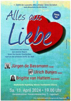 Samstag, 13.04.2024, 19:00 Uhr Kunterbunte Lesung im evangelischen Gemeindezentrum Hagenbach. Unter dem Motto „Alles aus Liebe“ lesen drei Autorinnen und Autoren aus der Pfalz ihre besten Geschichten rund um die schönste Sache der Welt. Brigitte van Hattem, Jürgen de Bassmann und Ulrich Bunjes erzählen in Poesie und Prosa von Schmetterlingen im Bauch und auf dem Teller, von schicksalhaften Begegnungen, verwunderlichen Tischgesprächen und mehr als denkwürdigen First-Dates. Dieser Abend voller Herzklopfen und (Un-)Romantik wird von dem Gitarristen Mariusz Rzymkowski musikalisch unterlegt. Der Eintritt ist frei.