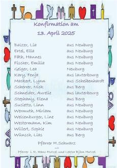 Mittwoch, dem 8. April 2025 von 17:15 Uhr (bis wir fertig sind) Probe für den Konfirmationsgottesdienst in der Ev. Kirche Neuburg