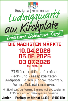 Am Freitag nach Ostern findet wieder der beliebte Ludwigsmarkt statt. Am 10. Mai 2026 erwartet die Besucherinnen und Besucher erneut ein vielfältiges Angebot. Neben einem Messerschleifer, der seine Dienste anbietet, gibt es wie gewohnt eine große Auswahl an regionalen und frischen Produkten: Weine, Fleisch- und Wurstwaren, Obst und Gemüse, Fisch- und Käsespezialitäten sowie Honig und liebevolle Geschenkideen. Zum gemütlichen Verweilen lädt der Bienenstock e.V. mit Waffeln und Getränken ein. Für herzhafte Genüsse sorgt Wild Rück mit leckeren Bratwürsten, während Emma & Paul wieder ihre beliebten Dampfnudeln anbieten. Nutzen Sie die Gelegenheit und starten Sie entspannt ins Wochenende auf unserem Ludwigsmarkt.